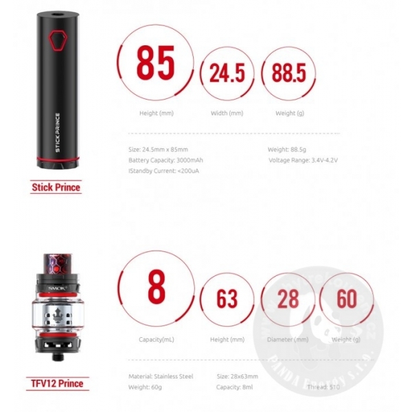 Elektronická cigareta Stick Prince přináší výkonnou baterii o kapacitě 3000mAh, která disponuje ochranou proti přebití a podbití a nespustí se, pokud máte nebezpečně nízký odpor žhavicí hlavy. Díky jednoduché světelné signalizaci tlačítka jednoduše rozpoznáte, kdy je potřeba baterii dobít. Smok tuto baterii osadil clearomizerem Prince s konvexní Pyrex nádržkou o objemu 8ml. Tímto spojením si tedy můžete užívat opravdu dlouhého vapování bez rušivých elementů dobíjení a doplňování liquidu. Široký výběr žhavicích hlav obstarávají čtyrspirálkové Q4 a M4, šestispirálková X6, na míru šitá RBA a monstrozní desetispirálkový výrobce páry T10.