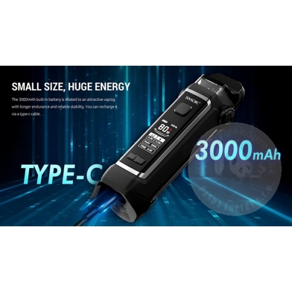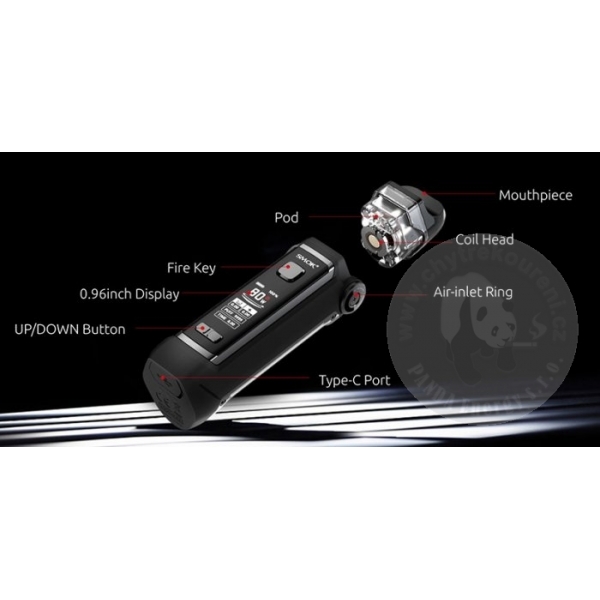Není určeno pro náplně obsahující nikotin! Smoktech IPX 80 je kombinací odolného gripu a výkonného POD systému. Odolnost IP67 zaručuje odolnost vůči nechtěným pádům a vniknutí vody či prachu do zařízení. Integrovaná baterie o kapacitě 3000mAh disponuje nastavitelným výkonem až 80W. Ergonomické tělo z nerez oceli a kůže zdobí 0,96 palcový displej, který umožňuje jednoduché nastavení hodnot a zobrazuje všechny potřebné informace. Baterii lze jednoduše nabít pomocí USB-C portu, který poskytuje rychlé nabíjení. Mezi jeho další přednosti patří ochrana proti zkratu, přehřátí a podbití, či 8-mi vteřinová ochrana žhavení. IPX 80 nabízí cartridge pro žhavicí hlavy RPM 2 s jednoduchým bočním plněním o objemu 5,5ml. Na boční straně gripu najdete kolečko pro optimální nastavení přívodu vzduchu.